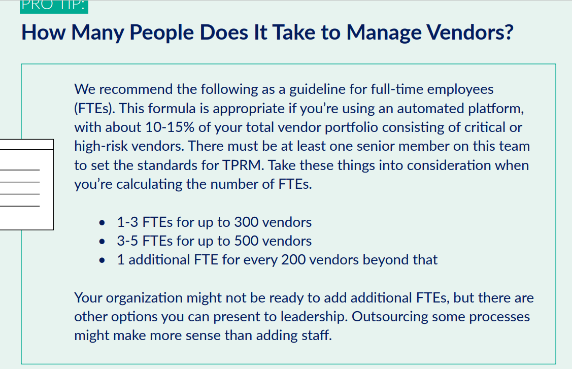 We are a small team looking at our resourcing and are wondering if there is benchmarking available for appropriate TPRM team size (based on vendor base/spend/etc). Does anyone know of/have any resources on this? Thanks!